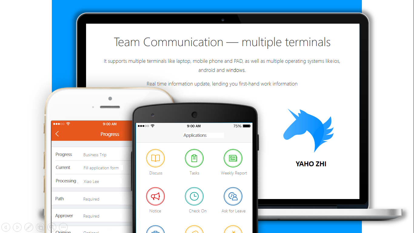 "YAO ZHI" is a corporate communication and co-working application, provides major functions such as real-time communication, picture sharing, task collaboration, establishs working group for particular task and turns it into joint task by group discussion conclusion, and provides project management based on monitoring of daily tasks, improving overall work efficiency.